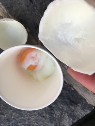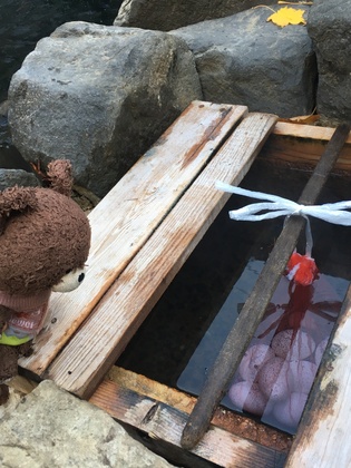 足湯の公園では玉子のための温泉もあり、用意したいった玉ねぎネットに玉子を入れてセット!足湯しながら待つこと20分。