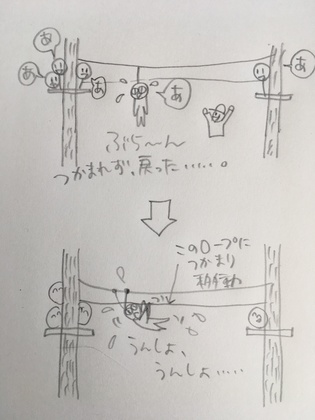 スタッフのお兄さんが来て「横のロープを掴んで引き寄せて自力で進んでくださーい」